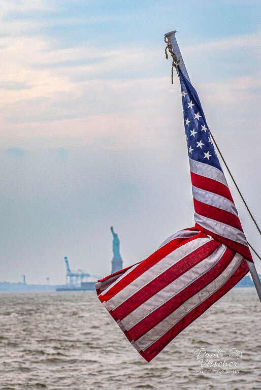 Then came one of my favourite frames from the entire trip: an American flag snapping in the breeze, with the Statue of Liberty just visible through the haze. Two symbols layered in a single moment — freedom in the foreground, promise in the distance. It felt impossibly cinematic, the kind of image you think only exists in films until you’re standing there, watching it unfold in real time.