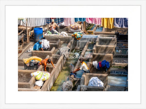 A bustling scene from the famous Dhobi Ghat in Mumbai, India, a large open-air laundromat that has become both a cultural icon and a photographer's dream.